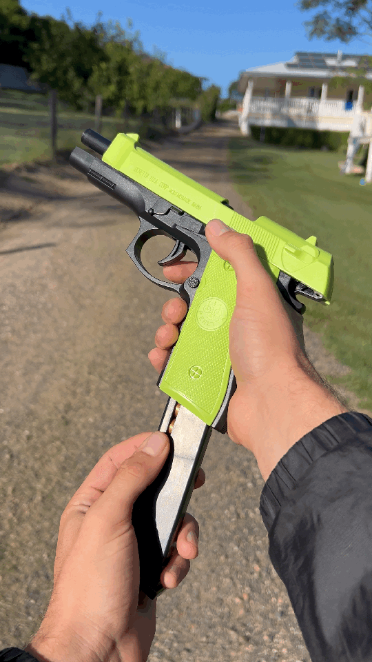 The Peace Lightning comes fully equipped with both shell ejection and projectile shooting mechanisms. Simply load the plastic pellets into the shells, then into the mag and fire away.